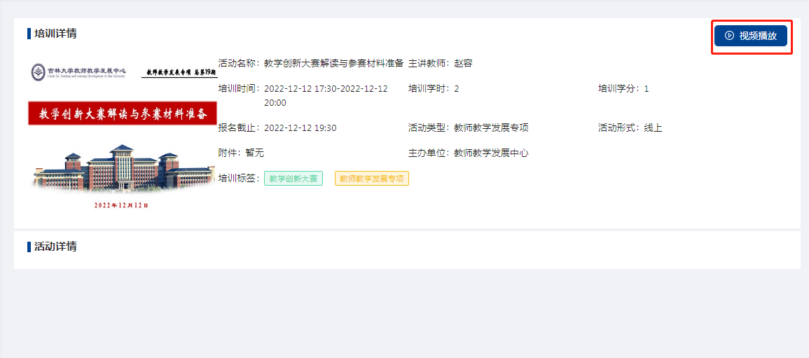 回放须在校园网或VPN网络环境下,登录教师教学发展数据与业务管理系统(https://jfywxt.jlu.edu.cn),依次点击“XX培训”→“视频播放”,观看视频。