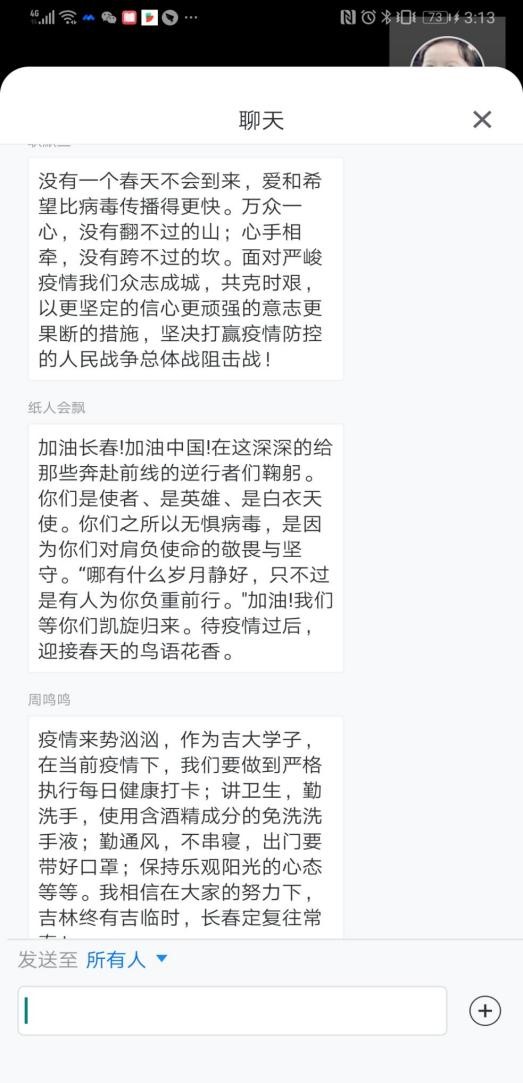 下午三点,会议准时开始。首先,团支书耿墨兰向各位参会同说明了本次举行线上会议的主题,并向大家分享近段时间以来长春市和学校的疫情防控形势,要求大家做好个人防护,配合学校打好疫情防控阻击战。随后,冯楠老师鼓励各位同学踊跃发言,阐述自己关于抗击疫情的感想和抗疫宣言。会议上,大家积极献言,很多同学表达了鼓励同学、感谢一线工作人员的感言。大家用朴素而真挚的语言表达了对抗疫必胜的决心与信心。会议最后,冯楠老师向各位同学转达了学校以及学院对大家身体的密切关注,并再次强调了在宿舍封闭管理期间的注意事项。