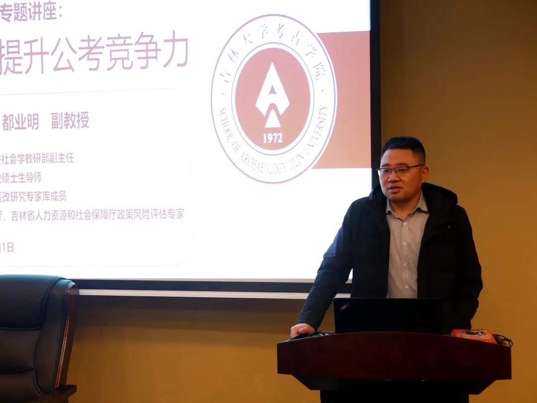 讲座上,都业明副教授从公考前需要思考的几个问题、公考考察能力要素以及如何提高公考竞争力三个方面向同学们传授公考经验。